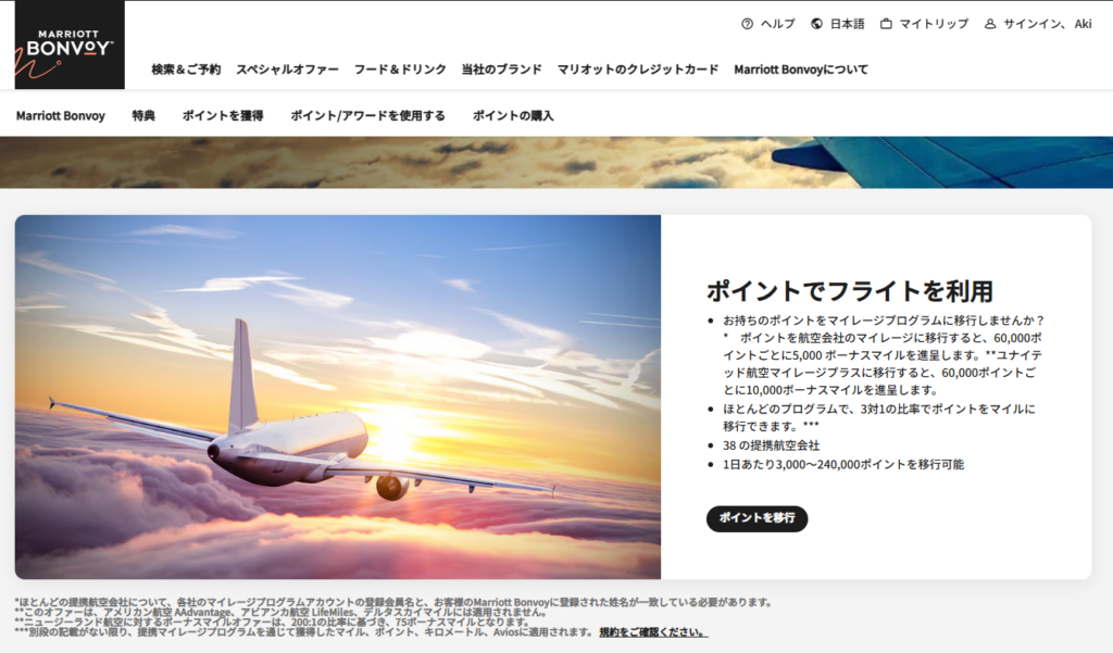 マリオットポイントからマイルへの移行方法